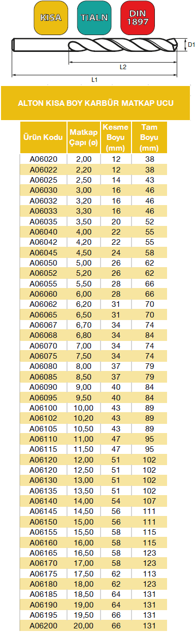 ALTON 20.00mm KISA BOY KARBÜR MATKAP UCU