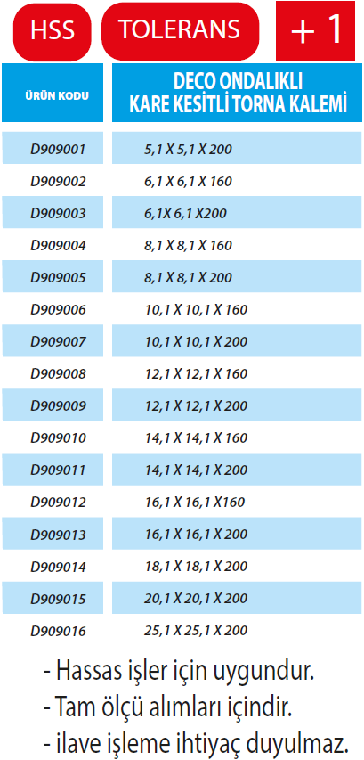 DECO 12.1X12.1X160 +1 (ONDALIKLI) KARE KESİTLİ TORNA KALEMİ